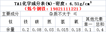 TA1钛合金密度为4.51g/cm3,是稀有的贵重金属,属于α型工业纯钛合金,是一种新型金属。钛的性能与所含氮、氢、碳、氧等杂质含量有关。TA1钛合金具有质量轻、比强度高、无毒无磁、低密度和比刚度高的综合力学性能,还有优良的耐热性、生物相容性、耐腐蚀性、表面可装饰性、韧性、耐酸碱性、耐高温、稳定性、冲压性能、塑性、机械性能,易于加工成型和焊接。