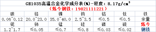 GH1035(GH35)高温合金密度为8.17g/cm3,是Fe-Ni-Cr基固溶强化型变形高温合金,以路和等元素进行固溶强化,使用温度在900℃以下。GH1035高温合金热强性和GH3039镍基合金相近,有着较高的热强性。
